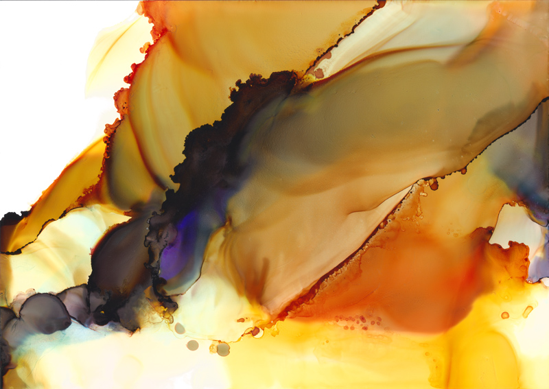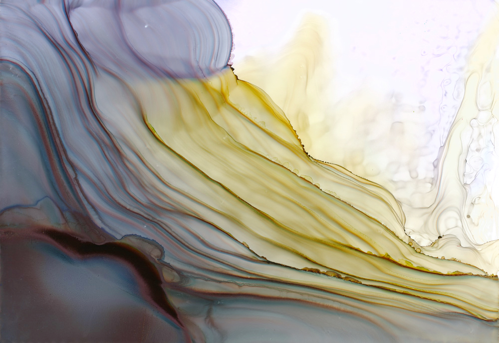 My technique uses ink, fluid acrylics and alcohol on yupo paper, plastic and aluminium substrates. It’s a bit like chromatography – each pigment is made up of many different colours, which combine and dry in unique ways. I scan the final images at high resolution and enlarge them up to ten times their original size to reveal crisp detail, silky textures and fascinating micro-worlds.