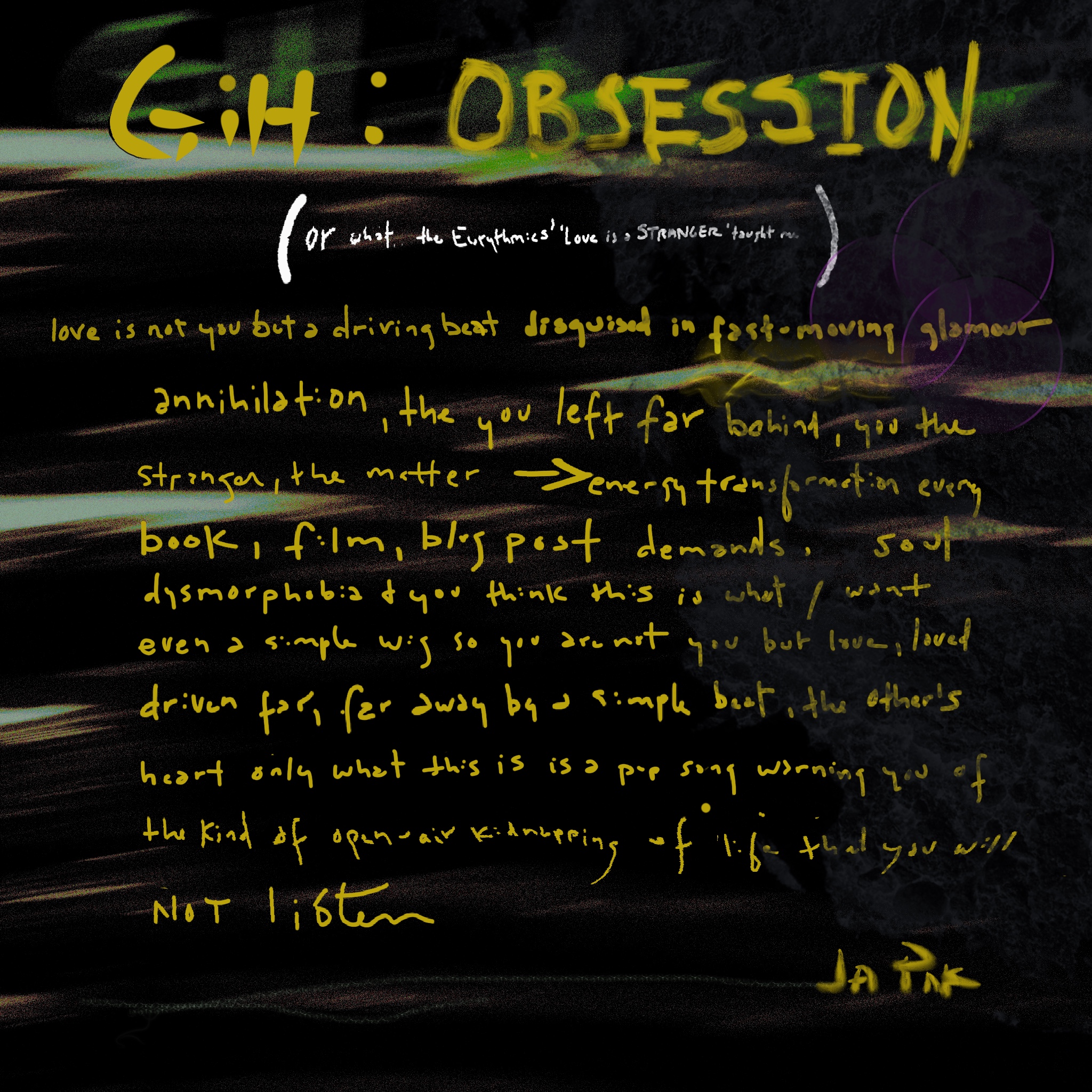J.A. Pak’s writing has been published in Porridge, Luna Luna, Joyland, Entropy, 7×7, Unbroken Journal, Queen Mob’s Tearoom etc. More of her work can be read at Triple Eight Palace of Dreams & Happiness.