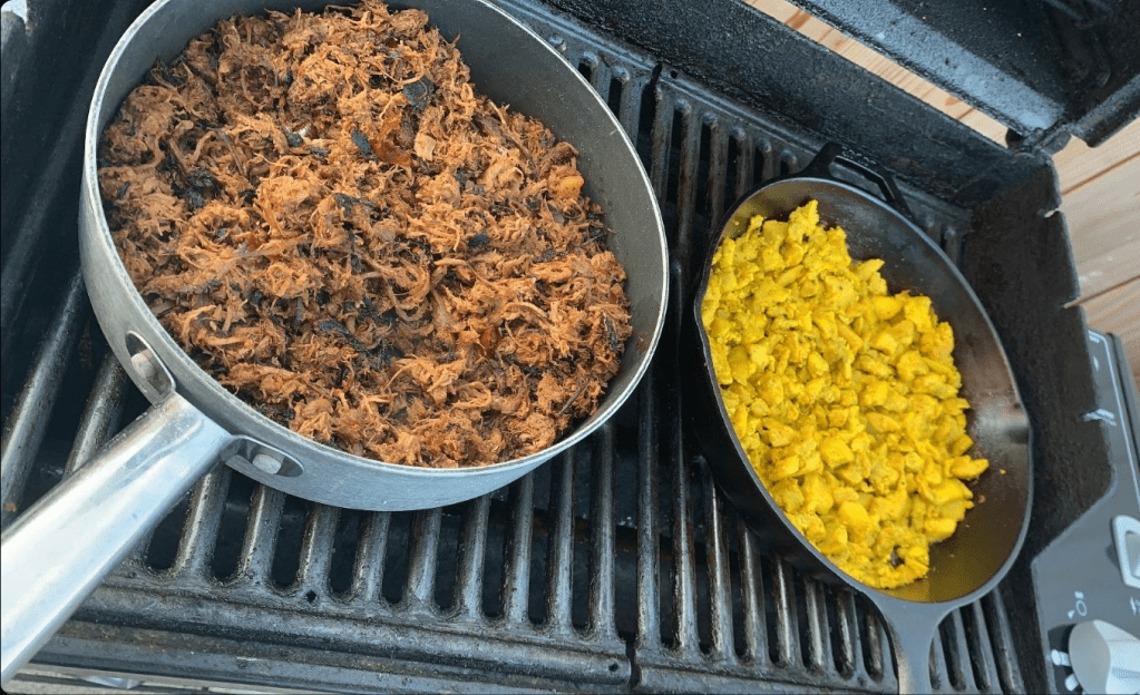 I started making tortillas every weekend to practice rolling and dry-frying them better and better each time. Eventually Pop started taking us to Las Montañas, a súpermercado in the adjacent neighborhood of San Pablo. By junior year of high school, this was an extension of home’s warmth for us. We’d cruise through on Sunday evenings to pick up our essentials for a full night of cooking: potatoes, house-made chorizo, cilantro and onions, fresh crema and queso Oaxaca, and house-made totopos, salsa and pico. And always a packed paper bag of mantecadas4 for the next morning. We’d go home. Pop and sis are responsible for shredding the cheese, dicing the onions and potatoes to fry with the bright red grease left behind by the pork, which we cook first.