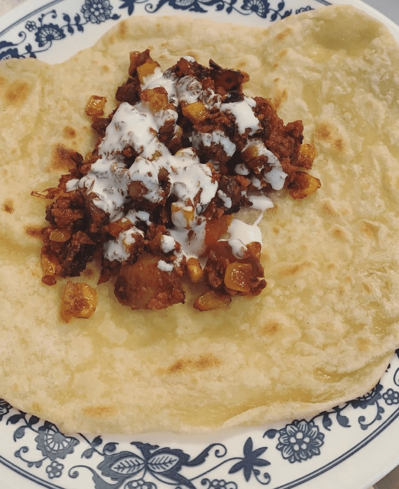 I stay in the corner of our kitchen, furiously rolling out the soft balls of dough into flattened circles (if I’m lucky; mostly they come out as lopsided ovals or sometimes, oddly, completely square). They cook on a broad dry pan. The white flour crusts over my hands, its downy softness billowing from the rolling pin to settle all over my clothes and face as I press my tortilla out. Then another, then another. I’m anticipating their chewy warmth. It’s always been my personal rule to never eat until they’ve all been cooked. Then I roll one in garlic butter, or pile it high with the colorful meat and cheese and cream, and remember to chew slowly.