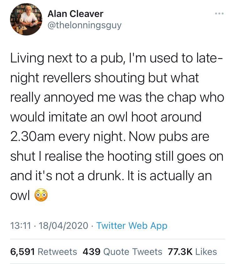 This touching passage reminded me of this tweet from earlier in the lockdown. Anecdotes and odd moments like these have permeated the last few months for me. People seem to be reassessing the places that have always held them, having nature revealed to them with comic timing.