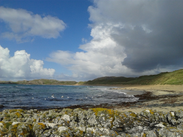 I sit back up, the ferocious wind whipping at my hair. Ahead of me sits Shillay, Vanessa’s Scottish bothy that has two big windows either side of a blue-painted door where my partner, Owen, stands smoking a cigarette. Both he and the house look tiny and vulnerable in the vast landscape of this Hebridean island which is flat except for a ridge of hills to the east. Below these hills are the bents, small hillocky sand dunes covered with the wind-bent grass that somehow thrives in the relentless Atlantic wind. The beach beyond is a crescent of fine white sand with rocky outcrops that are three million years old, some of the oldest and hardest rocks on the planet, and on a clear day the sea is a luminous turquoise with wispy clouds brushing a vast sky.