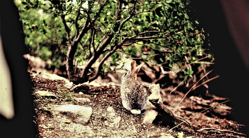 I stood under the alligator juniper that shaded my tent in the oak woods. Effie squatted between my feet. In The Maltese Falcon, Sam Spade called his receptionist Effie. But the Effie at my feet was no lady. I called her F. E. Cottontail in my journals. Cottontails are coprophagous – literally, Fecal Eating.
